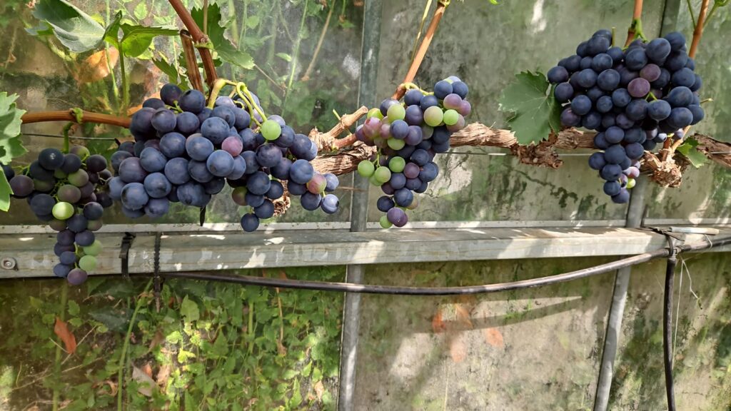- de kleuring van de tros, in het bijzonder bij blauwe druiven.